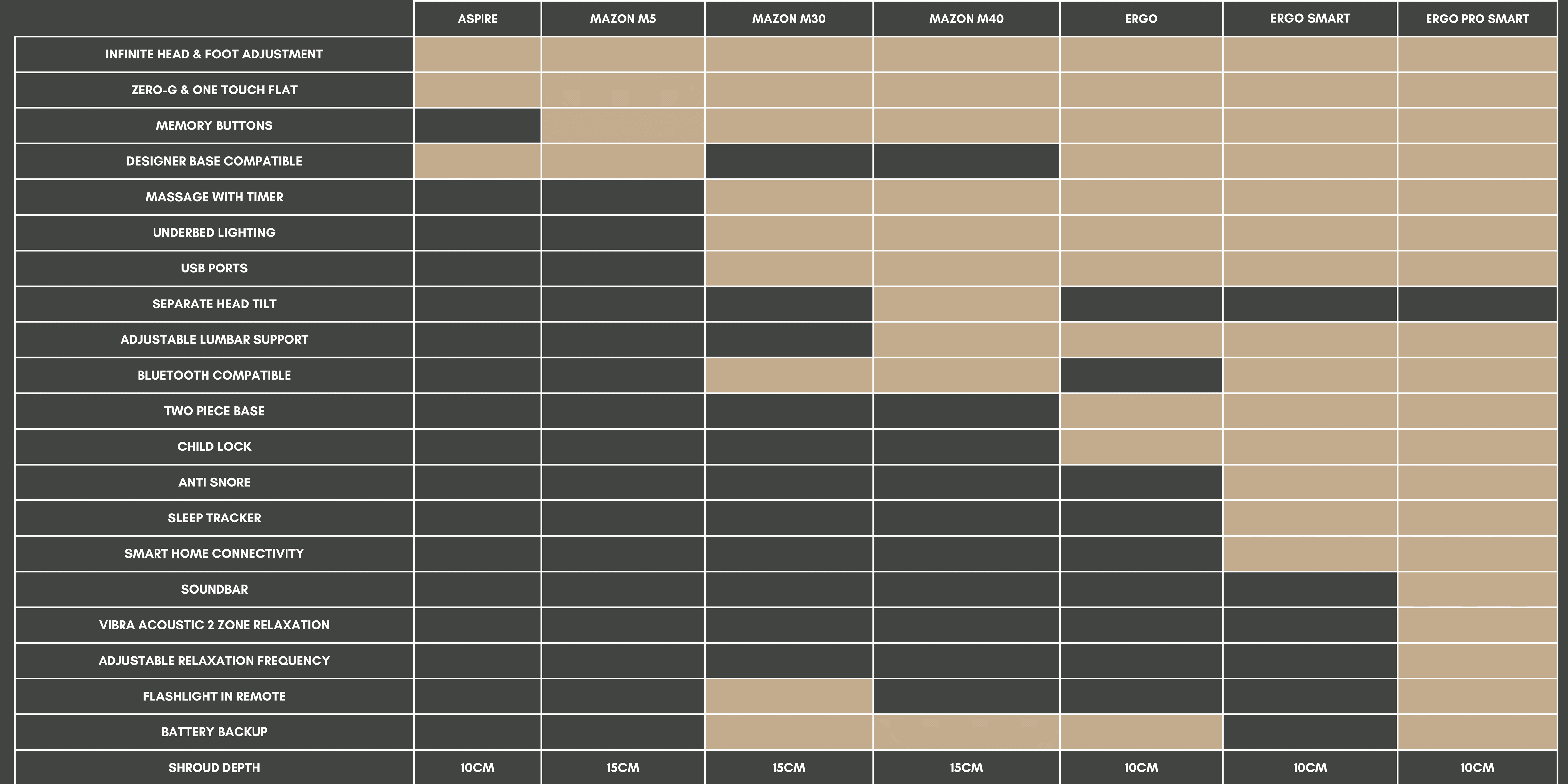 It’s now easier than ever to see what the difference is between our range of premium adjustable beds. In the table below, you can see the different features each of our beds offer, from zero gravity to bluetooth compatibility.