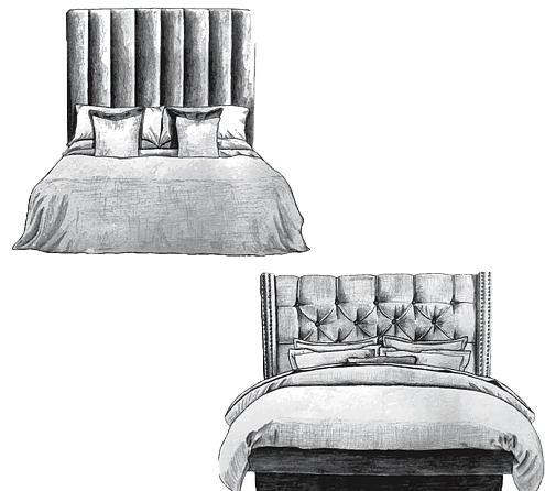 The same old chestnuts apply here: vertical lines will look skinnier than horizontal lines. Buttoned headboards will look more formal than plain headboards. Wings can help frame a design as can a border.