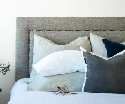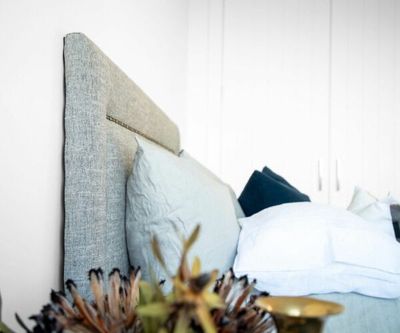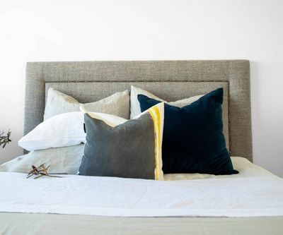 The Mazon Indiana headboard is a rolled edge design with a wide nail border and stud inlay.